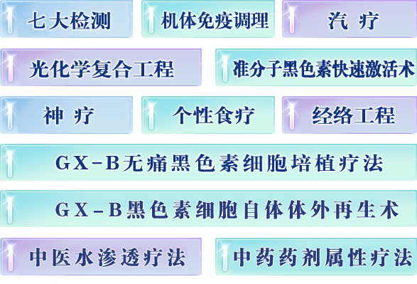 引进国际领先的细胞再生(C3)技术与细胞培植(Recell)技术,综合我院原有的GX-B分型多维白癜风康复工程,打造成为国内领先的白癜风治疗技术。技术主要采用中西医治疗的方式,药物治疗结合西医的靶向治疗,使药效直达病灶,控制病情后,通过自体提取正常皮肤黑色素,在体外采用细胞悬液培养,令黑素细胞再生。据了解,与以往的治疗手段不同的是,具有无创无痛,无炎症无感染,安全系数高,增生性瘢痕愈合形成新创面的风险几率为零;疗程短,20分钟培养黑素细胞;2小时内白斑区黑素细胞成活;5~7天角质细胞使创面快速形成上皮,黑素细胞繁殖迅速;2~3周后治疗部位颜色加深;供体皮肤组织仅需要提供2cm*2cm,可实现最大面积320平方厘米的白癜风治疗;患者没有任何排斥反应,黑色素体外再生繁殖,患者免疫力不受破坏,治疗后无复发;皮肤颜色与提取正常肤色部位同色,无色差等明显特征,这对缩短白癜风患者治疗疗程、提高白癜风治疗效果有着技术性突破。其沿用了白癜风研究院附属医院采取的中医辨证施治的原则,对白癜风首用调和气血、扶正固本的治则,采用药物治疗、微量元素调理和机体免疫力循环调理为本,黑素细胞自体体外再生为核,传统中医养生气疗、水疗和心理辅助治疗为辅,疗法多维、立体、综合全面,依据患者临床分型分类和分期,对患者进行分性治疗,令治疗效果直达病灶部位,更是最大限度的保证了治疗效果。